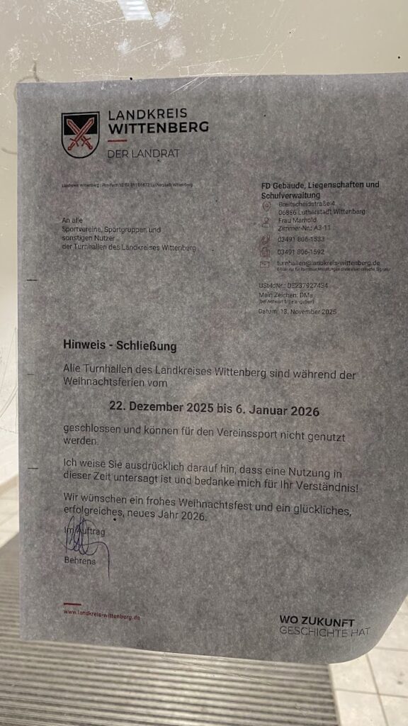 auch in diesen Weihnachtsferien sind die Turnhallen: Mescheider Straße (Training am Donnerstags) und Ferropolis (Training am Samstag) geschlossen, sodass in dieser Zeit das Training leider ausfallen muss.